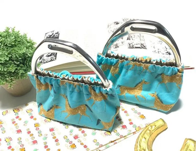 【乗馬用品】鐙カバーmini pink horse/BK 3 鐙用カバーです。 鞍に傷が付くのを防ぎます。 可愛いカラーと柄でリバーシブルで 作っておりますので、 洗い場で自分の鞍の目印にもなります。 そして上部がゴムなので、急いでいる時も 片手で楽に外せます。 そもそもカバーを作った理由は、 乗馬用品って高い、種類少ない、売ってない 。・゜・(ノД`)・゜・。 なのでPOPでカラフルな物を ちゃんと自分で考えて、線を引いて 何度も試作して、可愛いと思うものを 作りました!(❁ー̀ωー́)وキリッ 商品は全部可愛くって良質な 輸入生地を使用してまーす。 今回のは、ピンクの可愛いお馬柄と シンプルブラック地で作りました(=´∀`)♡ ピンクの牧草地で草をはむはむ馬。 ただの無地じゃなくて、 所々に濃淡のあるグレーや焦茶が 薄く重なるオシャレブラックです。 2個で1組になっています。 ※サンプルの鐙はシンプルな形のもので、 幅約14cm、高さ約16.5cm、 ステップ部分約4.5cmを 使用しています。 サイズ 高さ約9.5cm 幅 約16cm マチ約9cm ※※※※※コピー禁止(˙-˙乂) ※※※※※