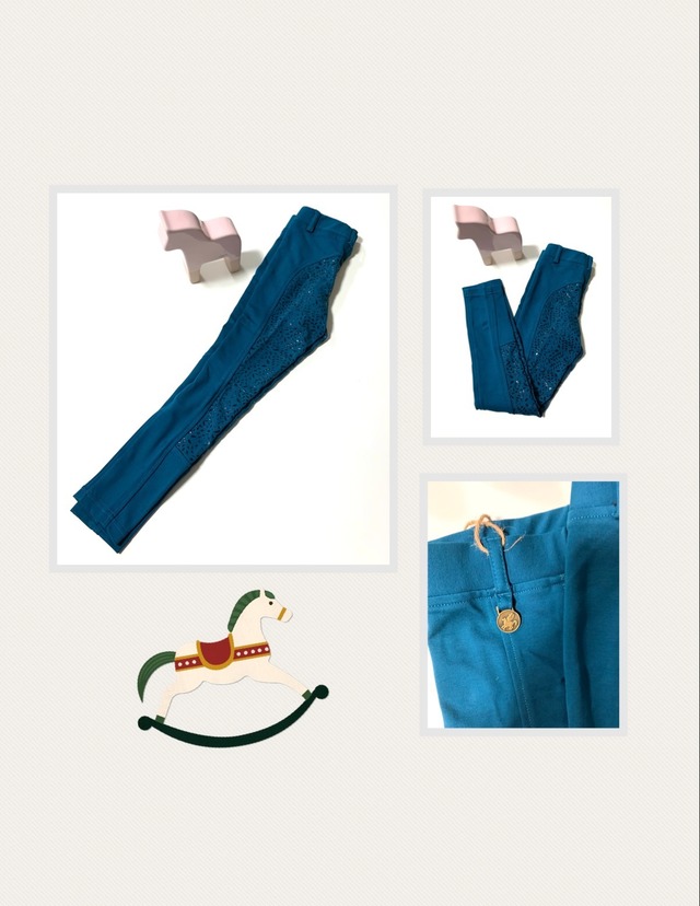 【乗馬用品】ジュニア用ライディングタイツ フルシートシリコングリップ 【製品情報】 練習に最適のミッドライズの ライディングタイツ。 フロントファスナーではなく、 履きやすいプルオンデザインです。 キッズ用ではありますが、しっかり サドルのグリップ力を高める シリコンフルシート! ベルトループに、ブランドのペガサスペンダント(って書いてありました)飾りもついてて可愛い(*´∀`*) また伸縮性もあり、とっても快適で、 ちびっこライダーに最適です。 【素材】 コットン 45% ナイロン 27% ポリウレタン 8% 【サイズ】 UK20 Eur128 ※実寸の股下 52cm 総丈 70cm だいたい6-8歳、120/130くらいで はないかと思います。 【color 】 Teal 青緑色